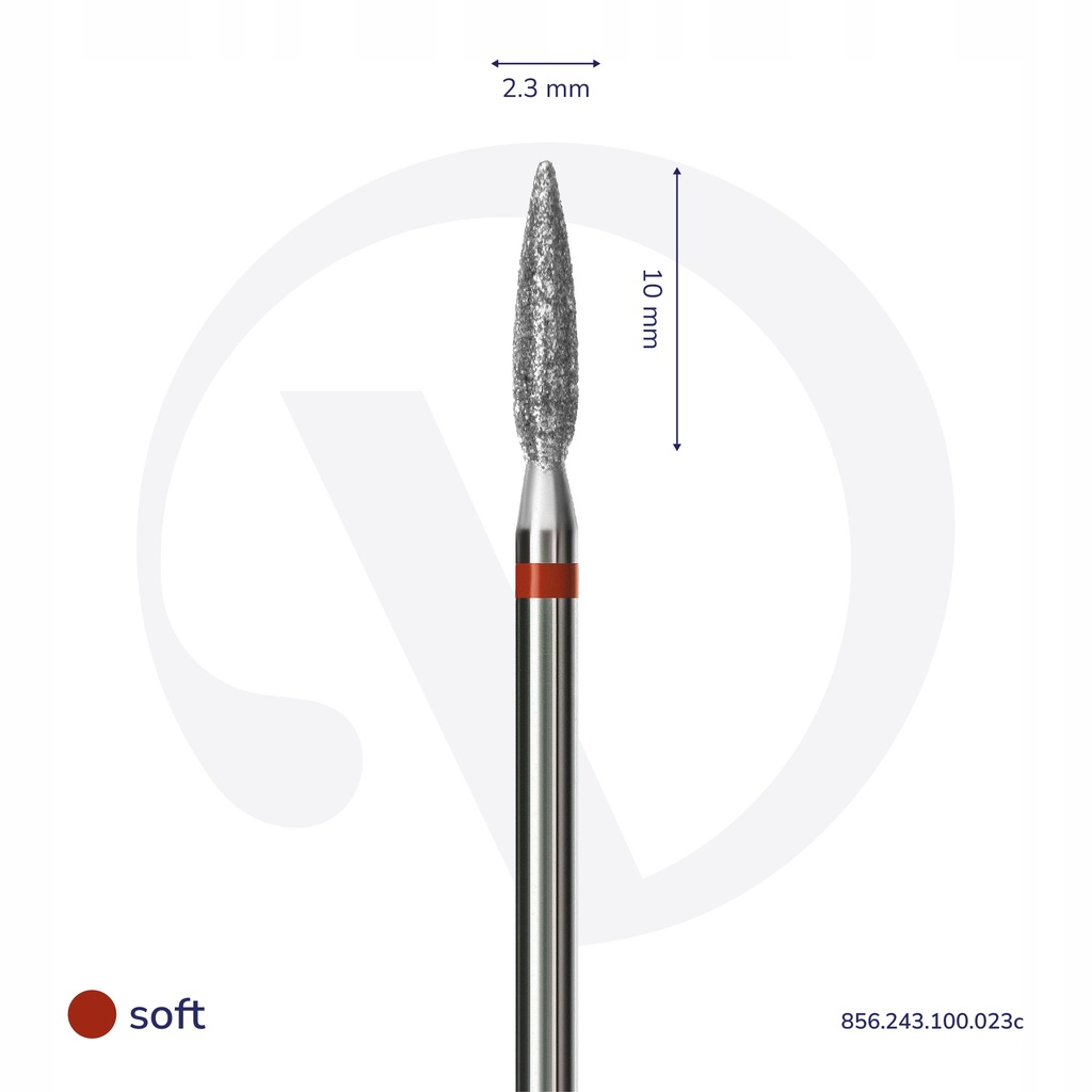 Frez diamentowy w kształcie płomienia z czerwonym paskiem jest idealny do pracy zarówno z delikatną skórą i łamliwymi paznokciami, jak i z pogrubioną płytką paznokcia oraz sztucznymi materiałami do przedłużania.